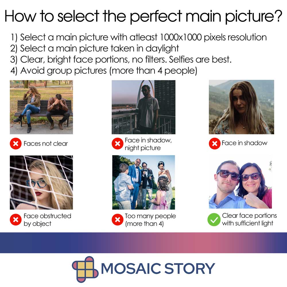For the main photo, select a photo with clear and large face portions, taken preferably in daylight, with bright face portion. Avoid group photos and photos with heavy clothing like wedding photos for the main photo. Resolution of atleast 1000×1000 pixels is required for the main photo. Selfies are the best for the main photos.
