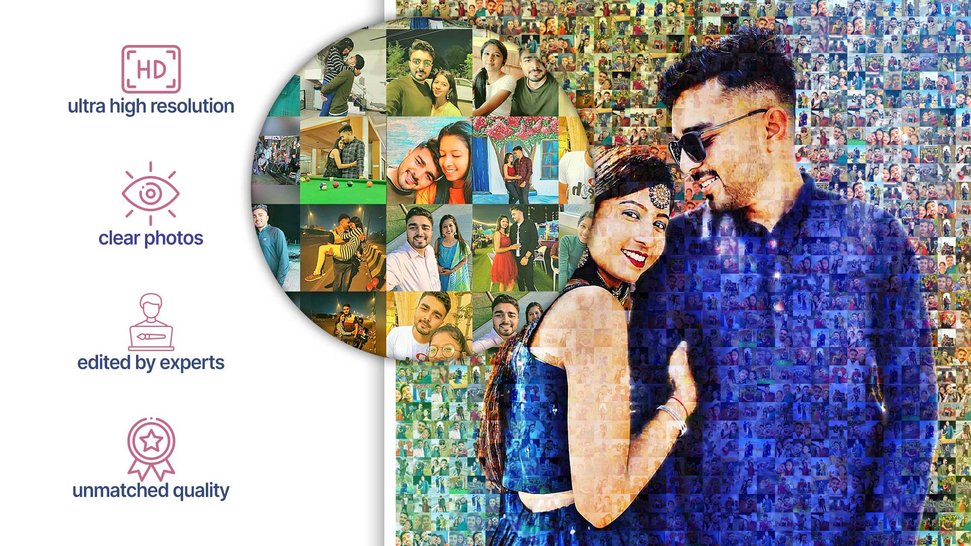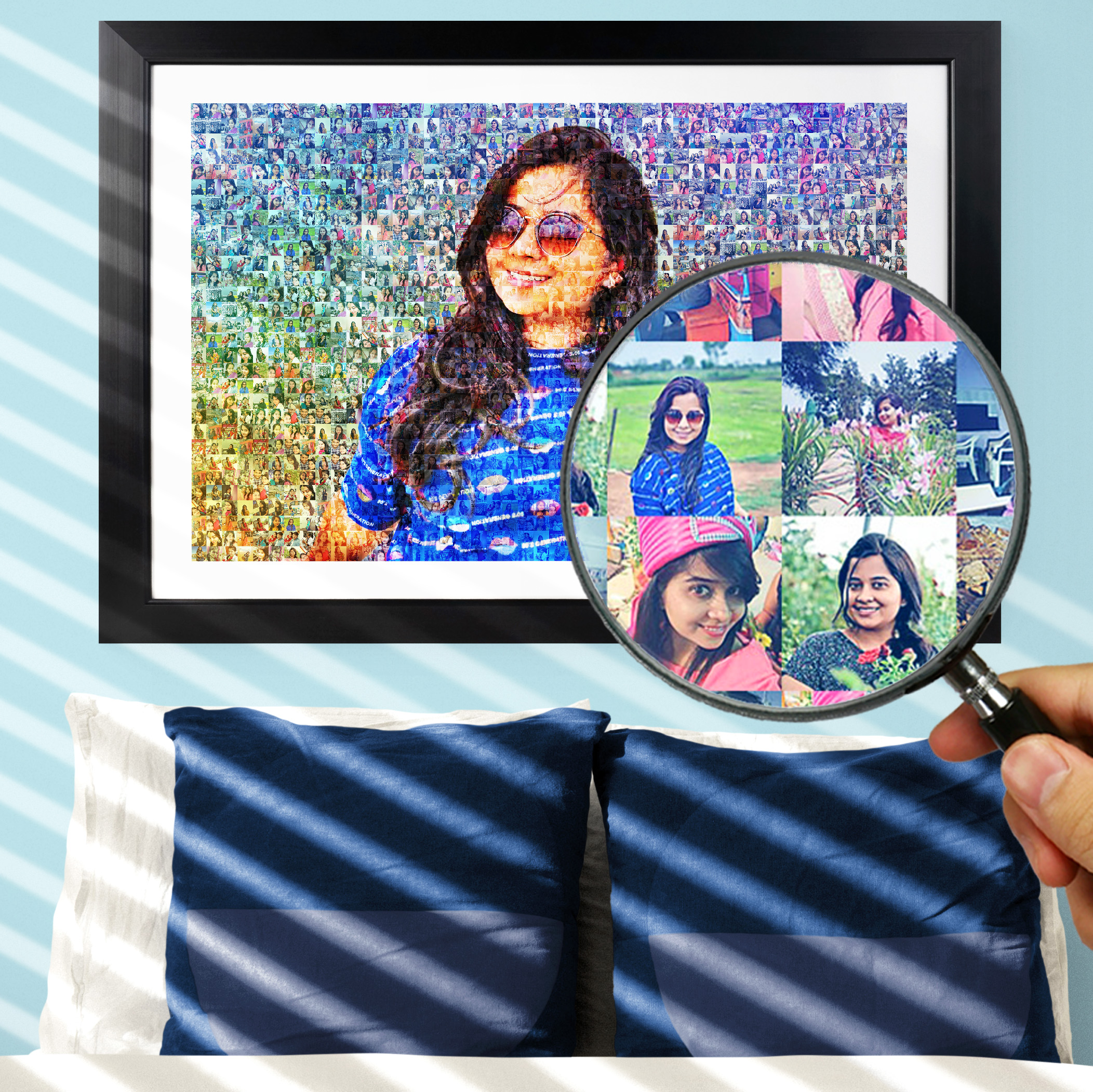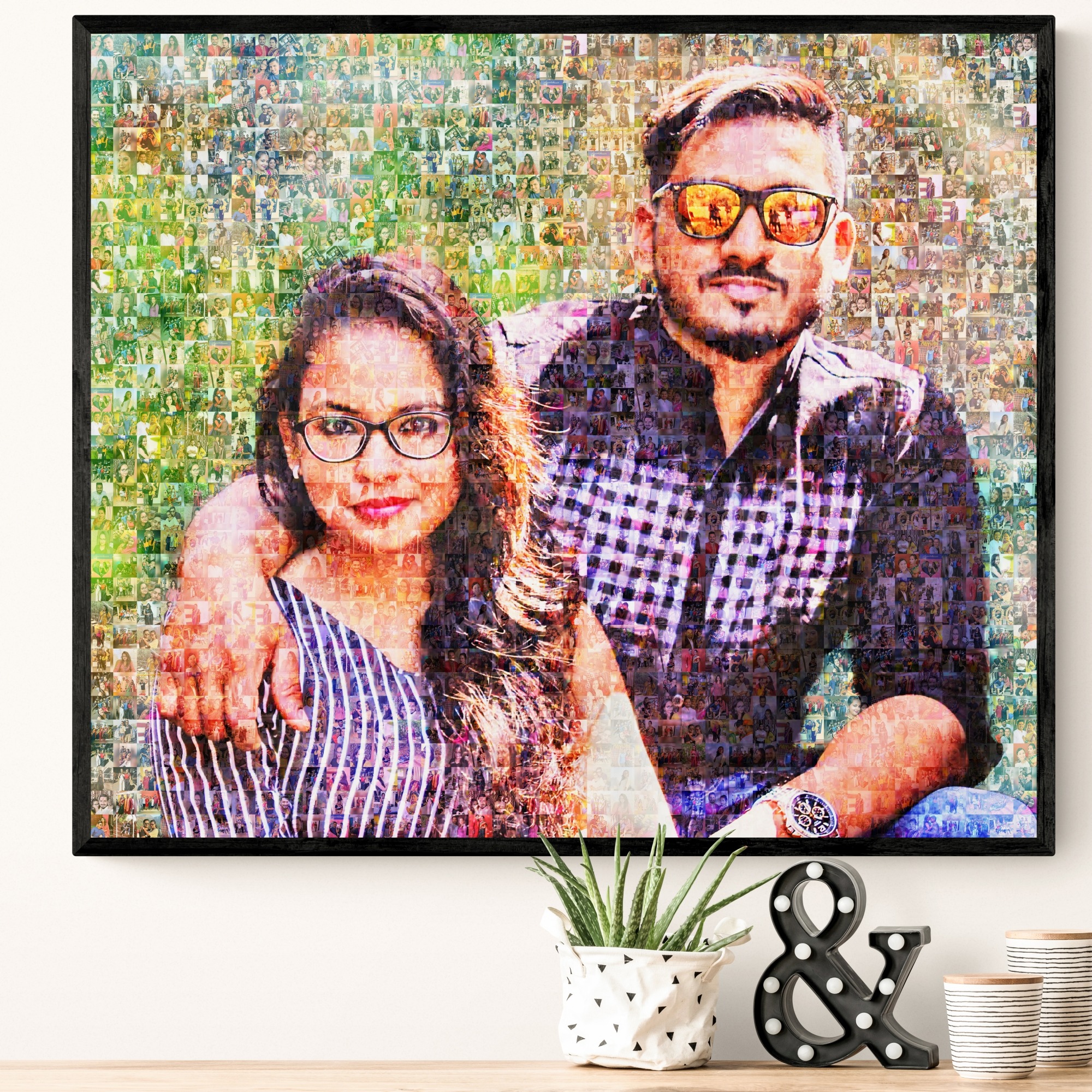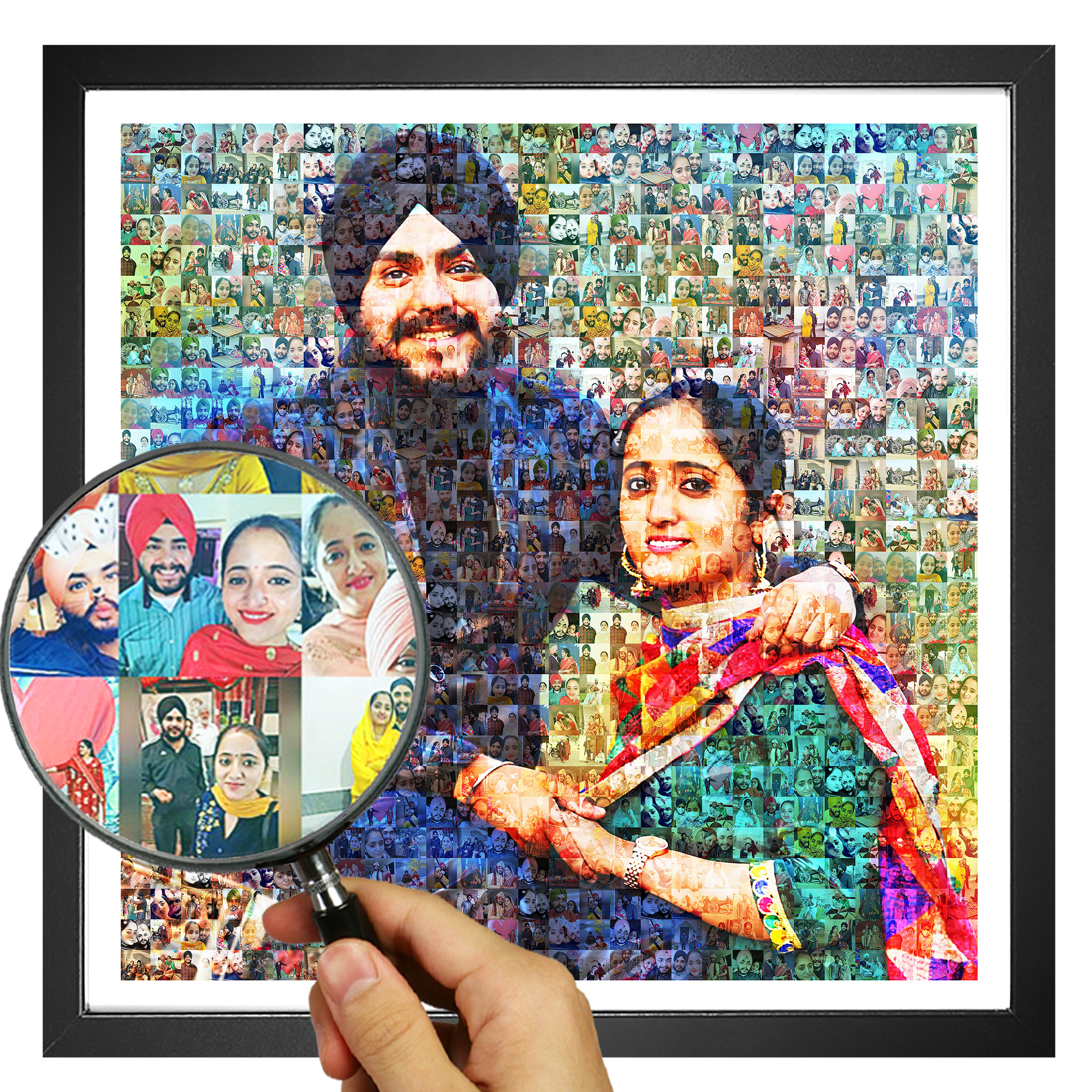 Each personalized mosaic photo frame is made manually by our expert designers. That’s why each mosaic we make is unique in it’s own way. We make multiple versions of your mosaic and let you decide the one you like. Also we listen to your requests and carry out corrections in your photos to bring the best quality possible.