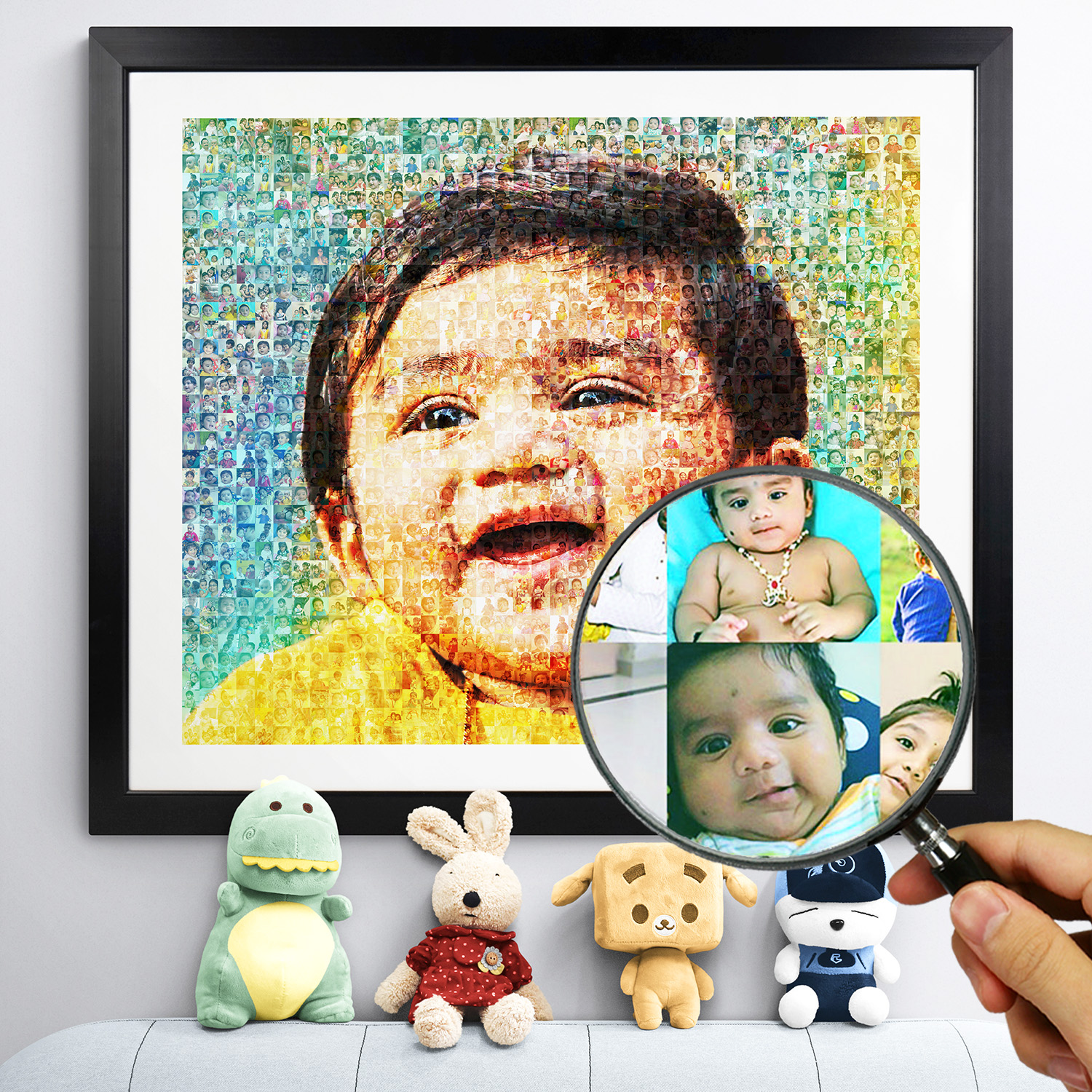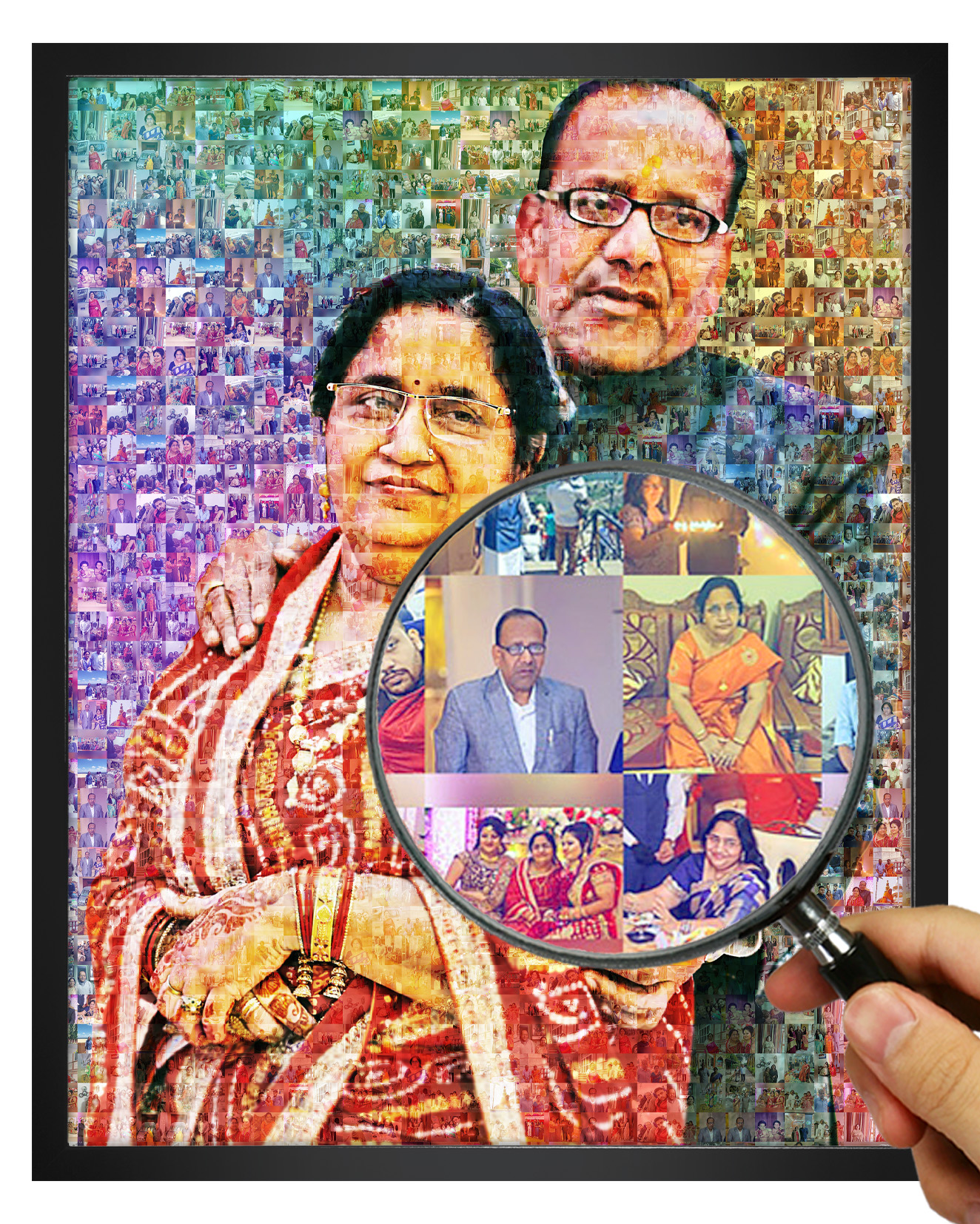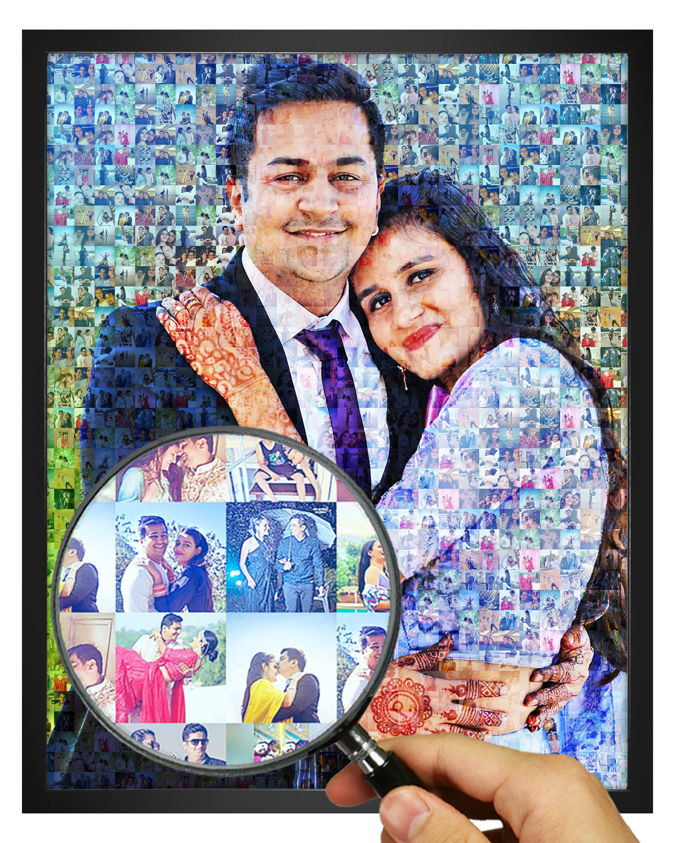 Each personalized mosaic photo frame is made manually by our expert designers. That’s why each mosaic we make is unique in it’s own way. We make multiple versions of your mosaic and let you decide the one you like. Also we listen to your requests and carry out corrections in your photos to bring the best quality possible.